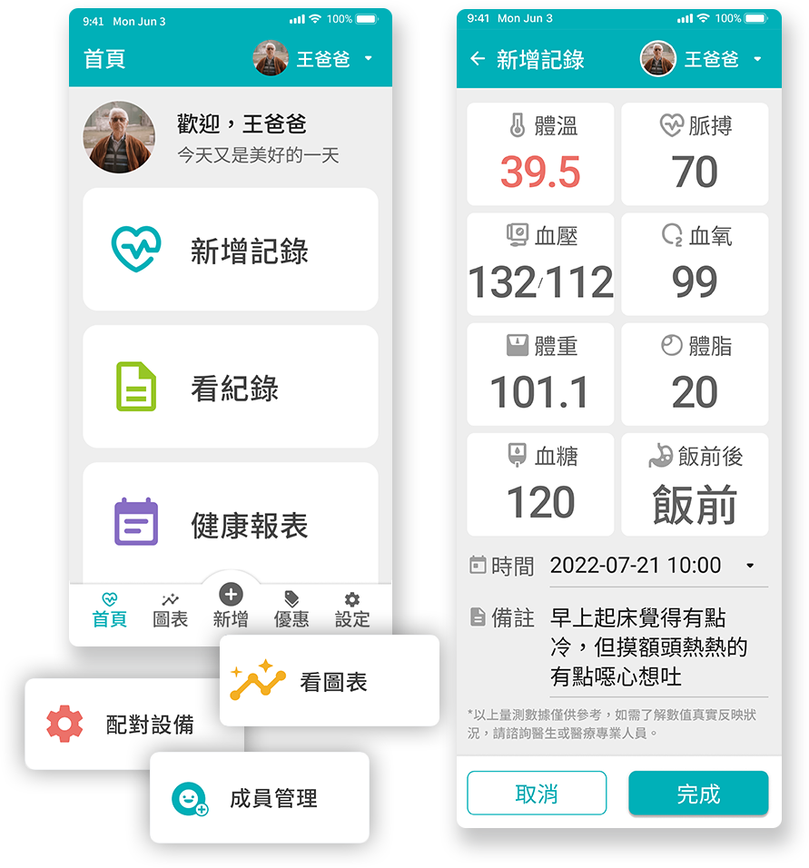 訪客模式試用 有手機號碼即可註冊 同個家庭僅需一支手機號碼註冊 長輩也能上手的健康管理App